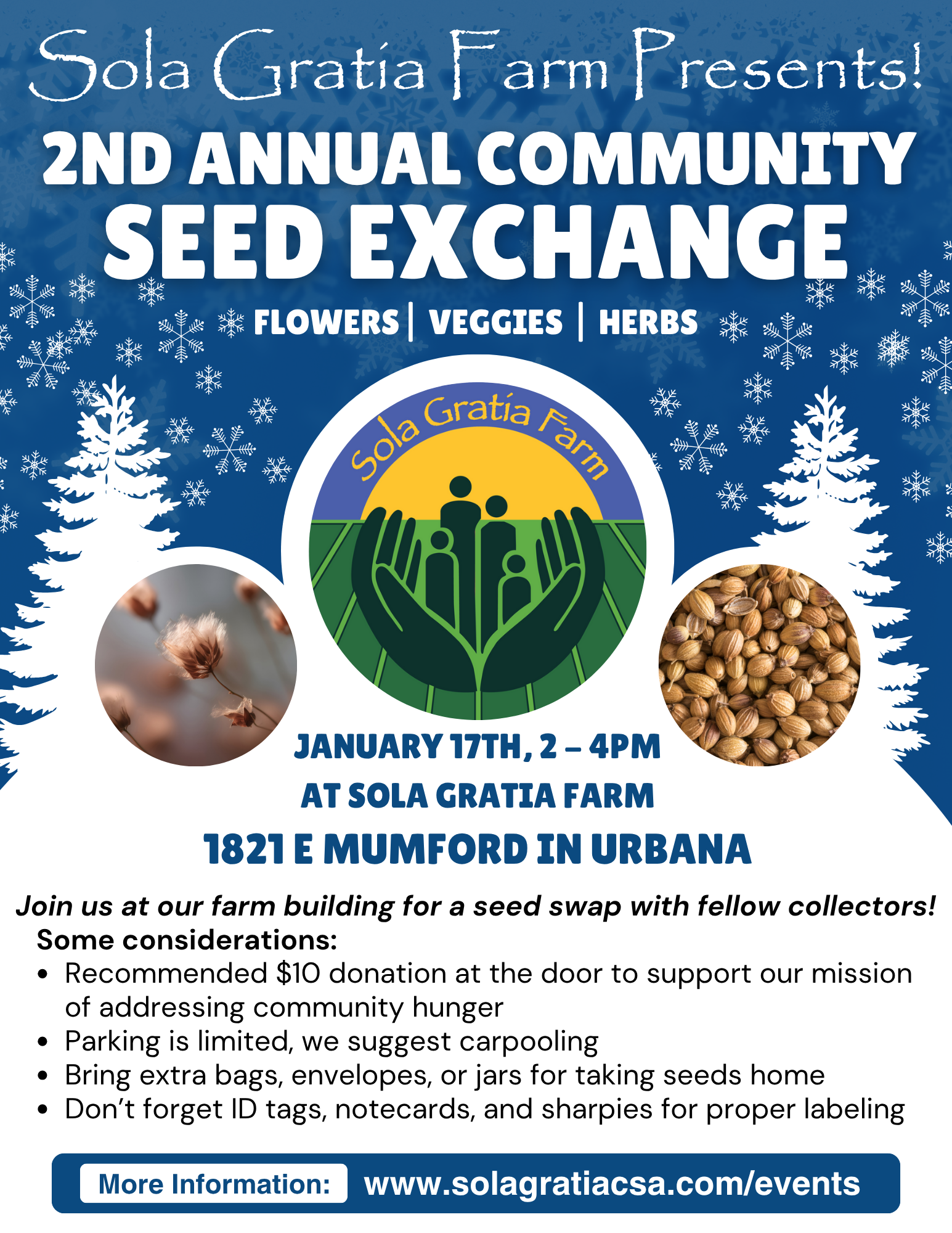 Seed savers of all experience levels are invited to come to the farm building, located at 1821 E Mumford Dr. in Urbana, for a seed swap!