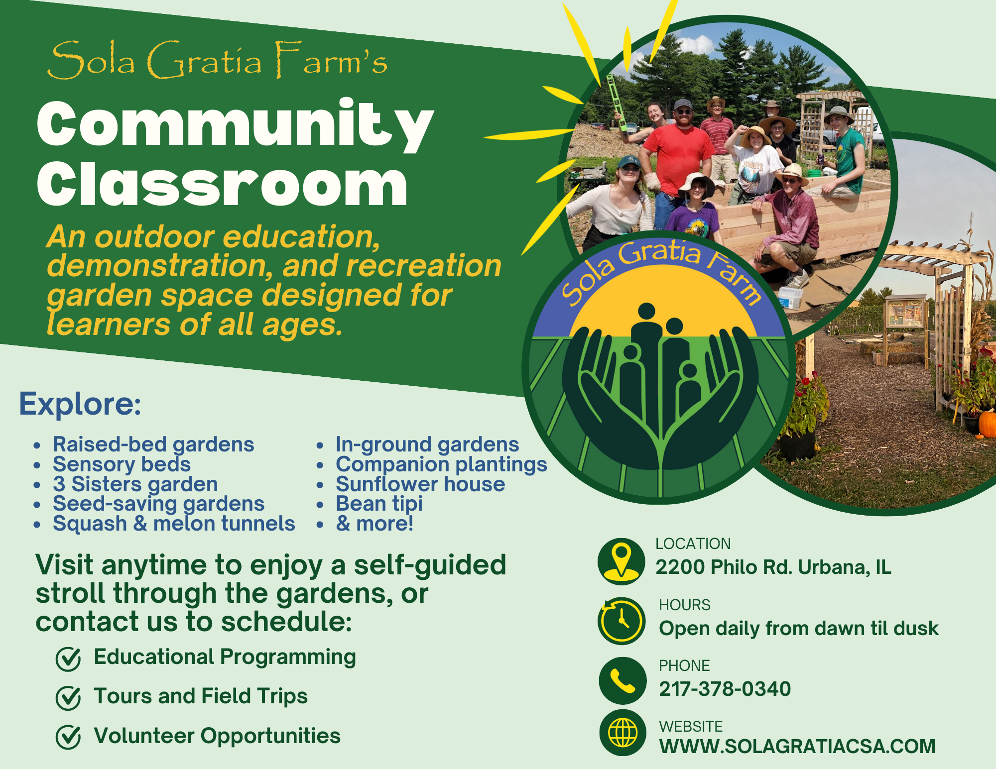 The Community Classroom at Sola Gratia Farm is an outdoor education, demonstration, and recreation garden space designed for learners of all ages. Guests are welcome to stroll through the various gardens, like traditional raised & in-ground beds, then explore the more experimental growing spaces, like the straw bale gardens, pea tipi, sunflower room, and sensory beds.