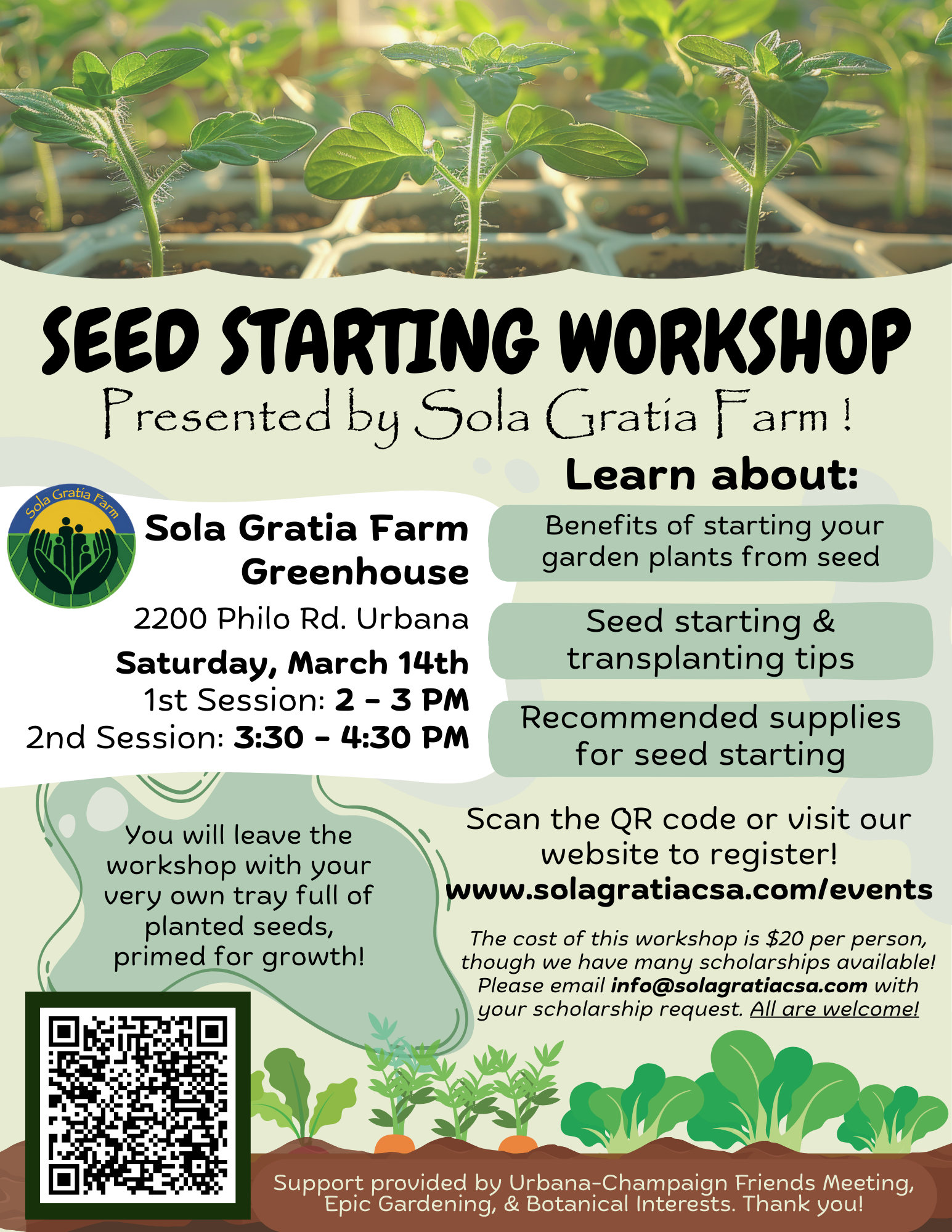 The Outreach/Education department at Sola Gratia Farm thanks Urbana-Champaign Friends Meeting, Epic Gardening and Botanical Interests for their generous support of this workshop. Thank you!We are inching through the last bit of cold weather, waiting patiently to carry out our dream gardening plans for the upcoming growing season. If starting your own vegetable, herb, and/or flower seeds at home is on your to-do list, but you’re feeling unsure of where or how to start, then we have the perfect class for you!