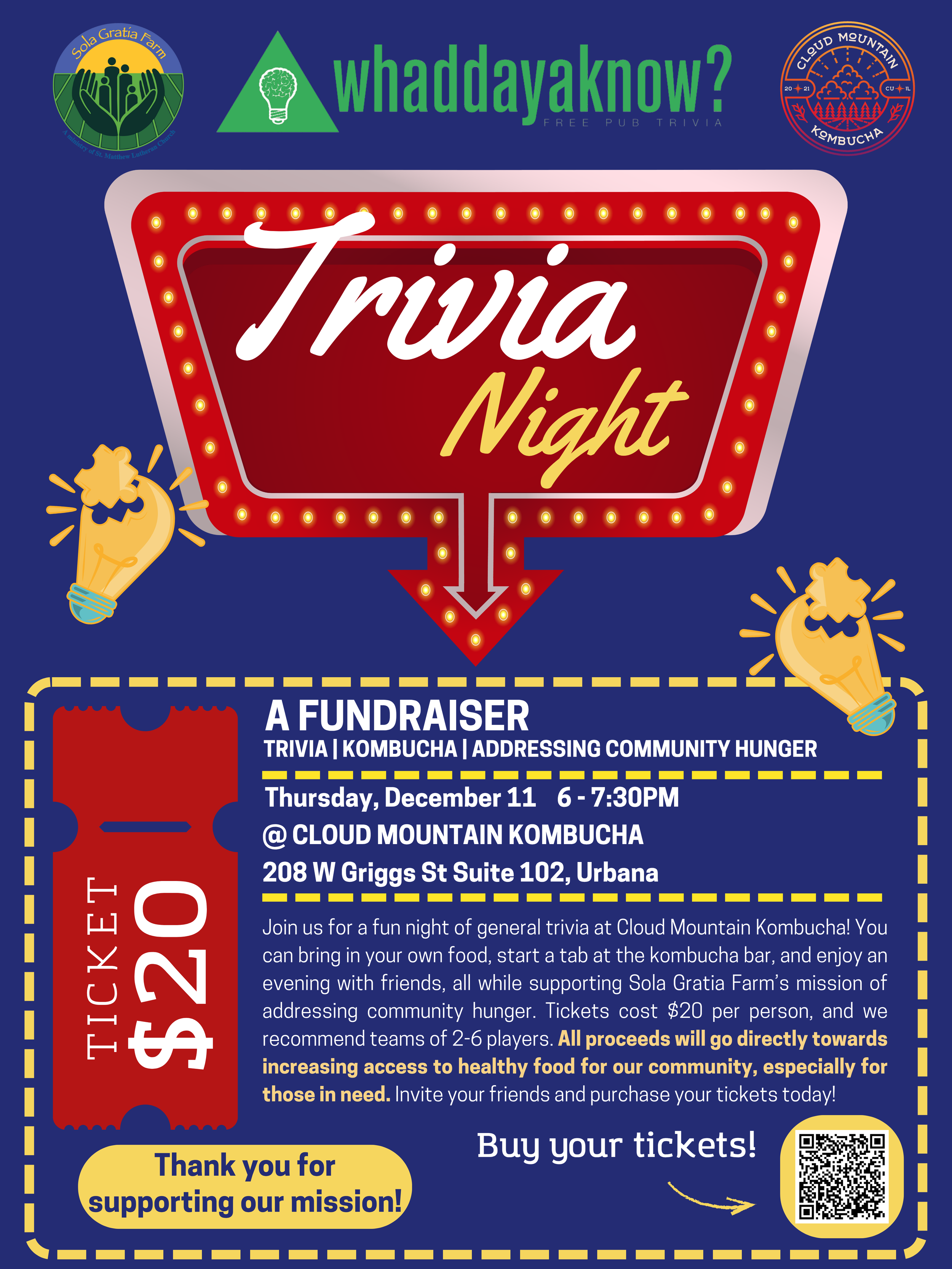 Join us for a fun night of general trivia at Cloud Mountain Kombucha! You can bring in your own food, start a tab at the kombucha bar, and enjoy an evening with friends, all while supporting Sola Gratia Farm’s mission of addressing community hunger. Tickets cost $20 per person, and we recommend teams of 2-6 players. All proceeds will go directly towards increasing access to healthy food for our community, especially for those in need. Invite your friends and purchase your tickets today!