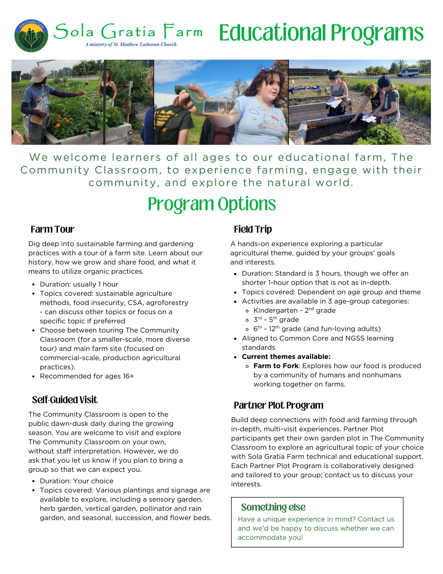 We offer a number of educational programs for school, after-school, and community groups! Please see our Educational Program flyer below for more information.