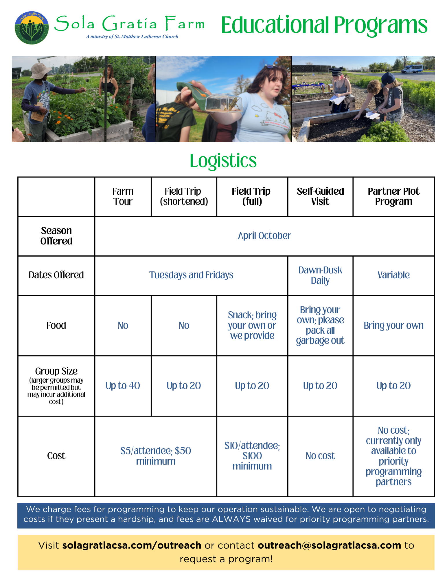 Unfortunately, due to the demands of the farming season, we cannot honor every programming request. Flexibility in scheduling is appreciated, if possible!